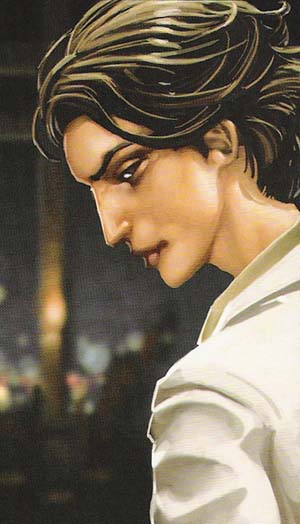 “For hver nat kommer de efter ham, det værste helvede har at byde på: Silkebånds-kongerne, De sorte flammer, Slagtehusets opsprættere, My Lais luftbårne kavaleri, ufødte fostre, der sværmer som en materie-gul storm. Den strålende klan, de ni med tjæresorte øjne, De gamle hornede adelsmænd, poeterne i deres både af huder. Hele den elendige flok kaster sig over ham, og de jager ham hen over den golde jord der løber fra Judas’ hals til Herodes’ oversvømmede fæstning.”