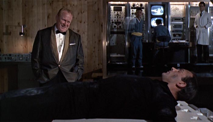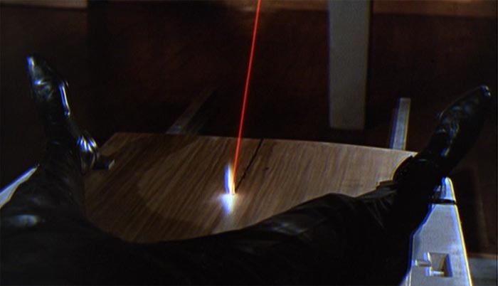 Men her går det også galt; Bond bliver taget til fange, og i én af seriens mest mindeværdige suspensesekvenser ligger Bond bundet fast til en enorm plade af guld, mens en kraftig laser langsomt nærmer sig hans skridt. “Do you expect me to talk?” spørger Bond, og Goldfinger svarer: “No, Mr. Bond, I expect you to die!”.