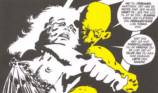 Den er på ingen måde rigtig dårlig, men den burde måske have været arbejdet igennem en gang mere. Blandt andet også fordi der er meget dialog i Det Gule Svin – langt mere end noget tidligere Sin City-bind, og faktisk også en anelse for meget, hvis man spørger mig. Stedvist bliver karaktererne meget snakkesalige.